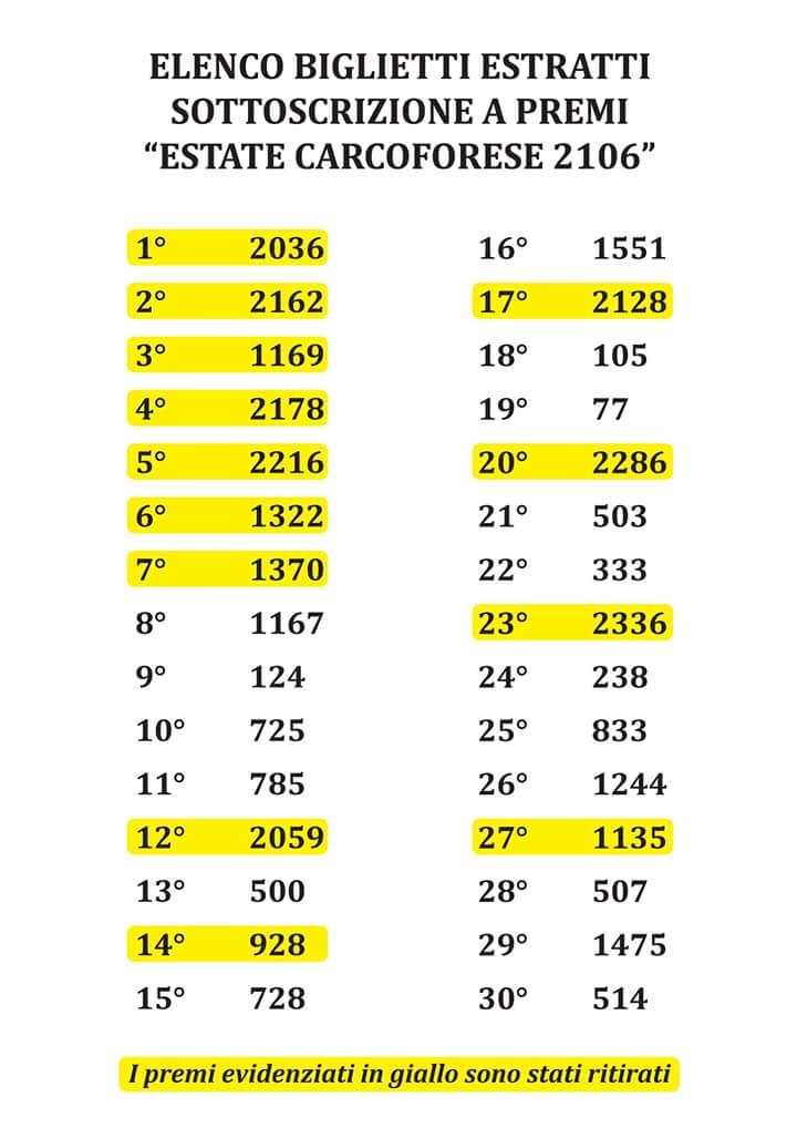 ESTRAZIONE PREMI ESTATE CARCOFORESE 2016 premi ancora da ritirare