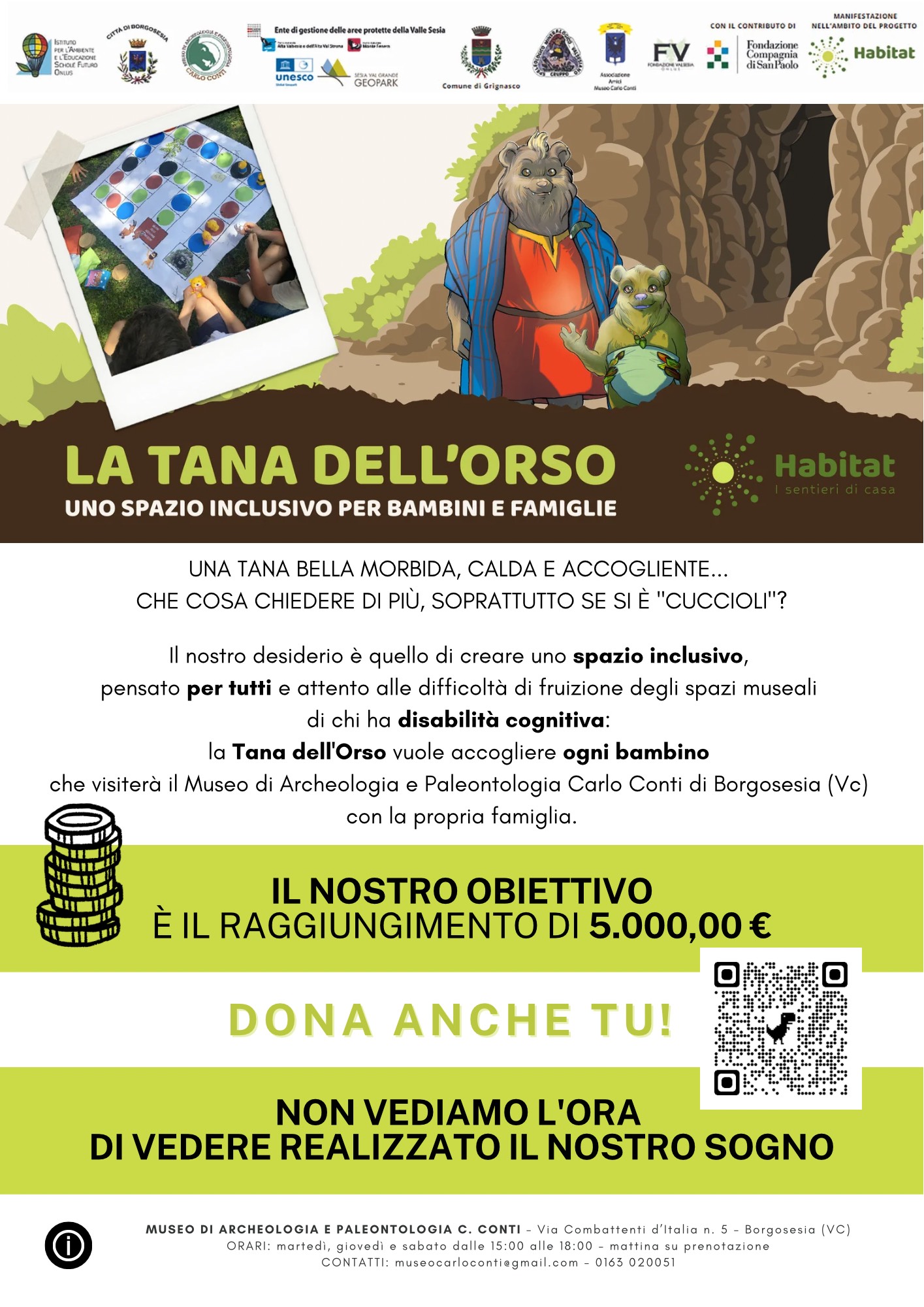 all'interno del progetto "Habitat, verso un parco culturale della Valsesia" stiamo portando avanti una campagna di crowdfunding dal titolo "La tana dell'orso", per rendere più accogliente il Museo di Archeologia e Paleontologia Carlo Conti di Borgosesia.
